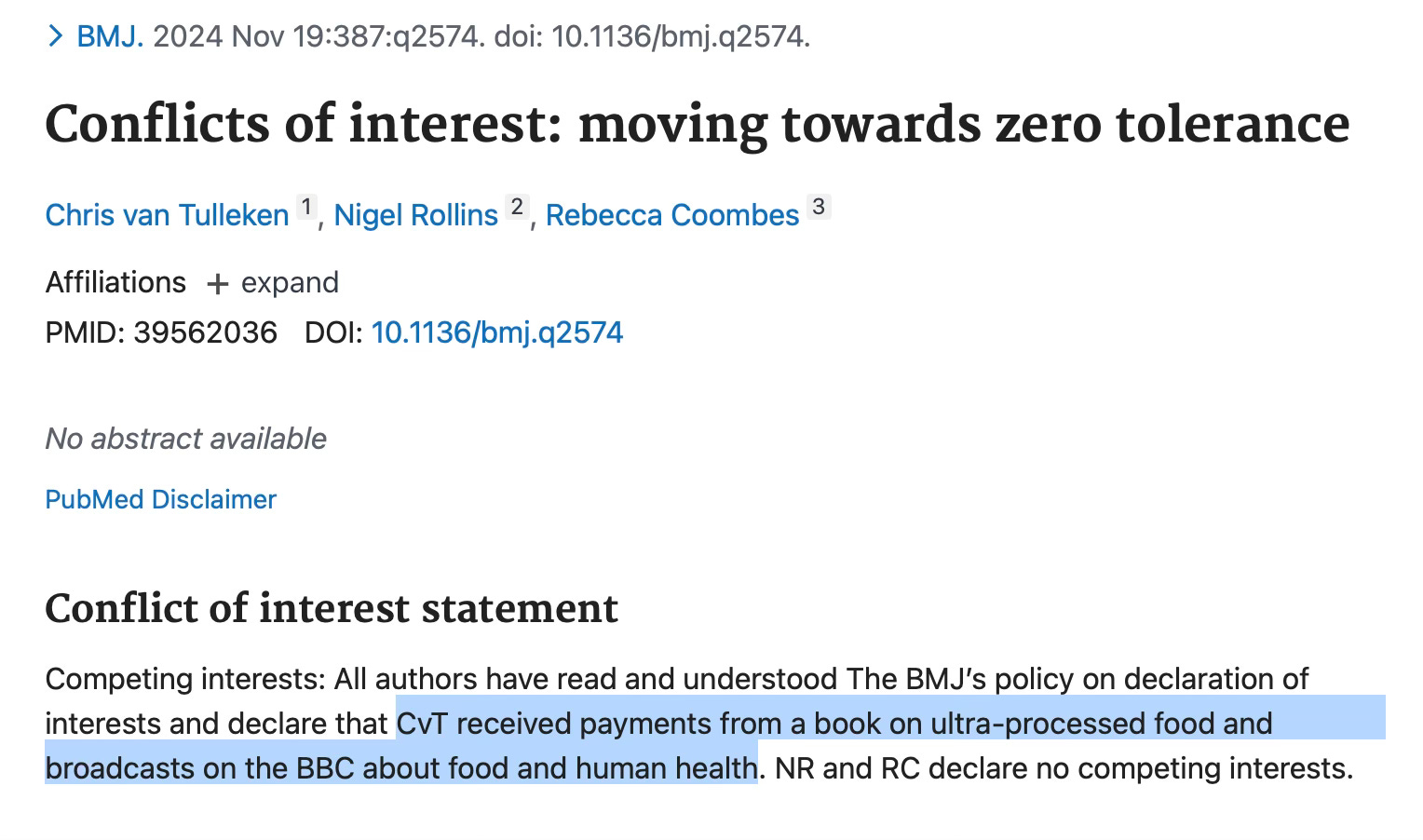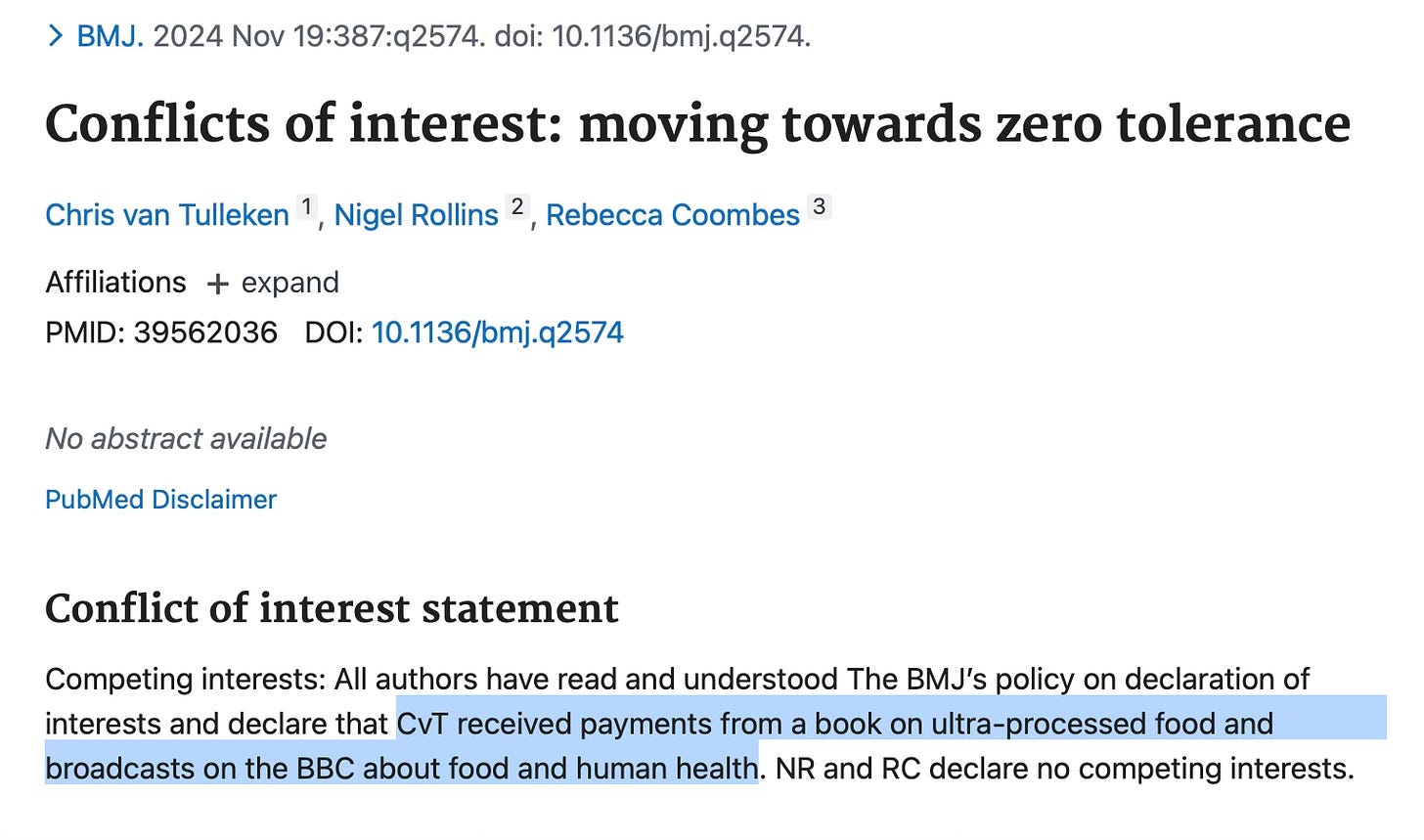 However, when reading Chris’ publication, I was rather confused as to why he only considered a conflict of interest to be accepting an industry paycheck. That’s a big one, of course, but I’d have thought Chris would know that conflicts of interest are more than a few bucks from Kellogg’s. Chris should know this more than anyone, in fact, since (rather hilariously) he had to write his own conflicts of interest statement in order to publish this opinion piece stating that we must adopt a zero tolerance approach to conflicts of interest. Plain in sight under the title reads ‘[Chris van Tulleken'] received payments from a book on ultra-processed food and broadcasts on the BBC about food and human health’. He might not have received industry payment, but he has certainly built a career off a scientific hypothesis (regarding the harms of ultra-processed food) and has been paid decent money to publish and speak about evidence in favour of his hypotheses. So unless he is trying to cancel culture himself from the world of science, I’m not sure how he can possibly think this zero tolerance approach is in any way reasonable.